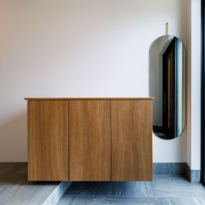 幅120㎝のゆったりとした洗面化粧台は、毎日の身支度が快適になる広さ。 横並びでもゆとりがあり、忙しい朝でもストレスなく使える設計です。 ライト付きの三面鏡が空間を明るく照らし、顔まわりをしっかり確認できるのも嬉しいポイントです。 サイドの収納には細かな日用...