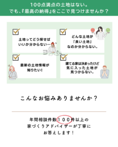 皆さまが抱える土地選びのお悩みを年間相談数100件以上の家づくりアドバイザーが丁寧にお答えします。