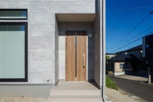 玄関には、しっかりと奥行きのある庇を設けました。 雨の日でも濡れにくく、荷物が多い日でも安心です。