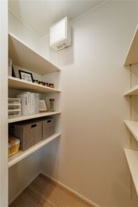 キッチンのすぐ横には、食品や日用品をたっぷり収納できるパントリーを設けました。